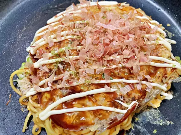ソースやかつお節をかけたお好み焼き