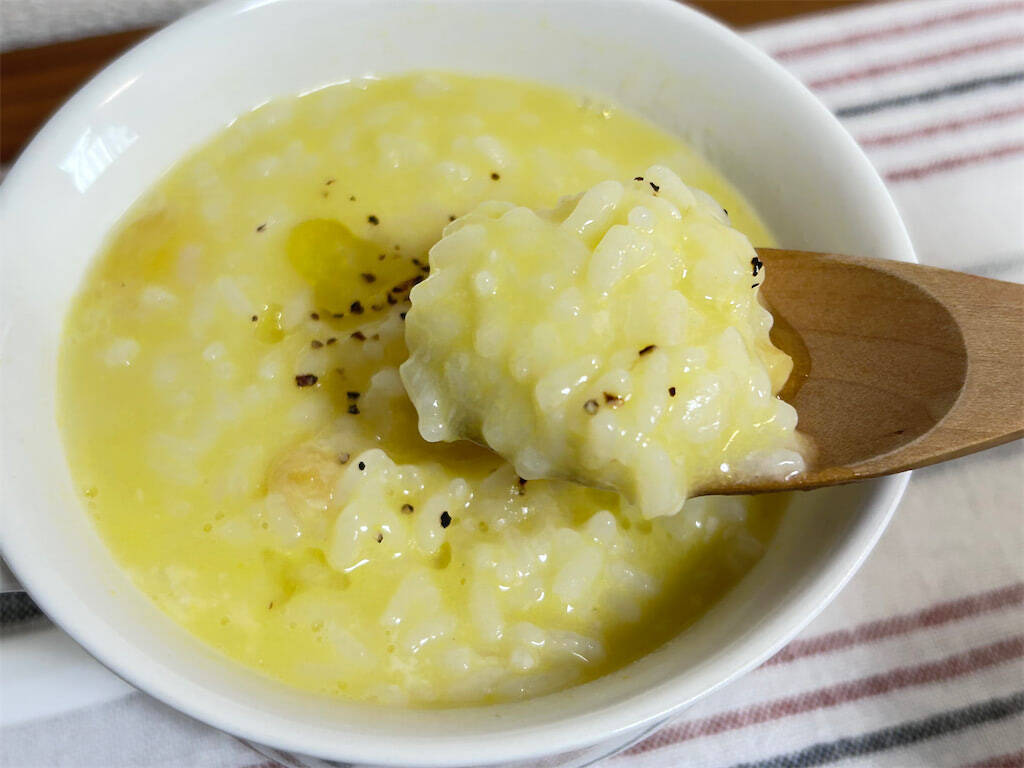 コーンの甘味と、チーズの濃厚さがたまらない!コクがあってトロッとしていて、まるでお店で食べるリゾットのよう。黒こしょうとオリーブオイルが、より風味を引き立ててくれています。