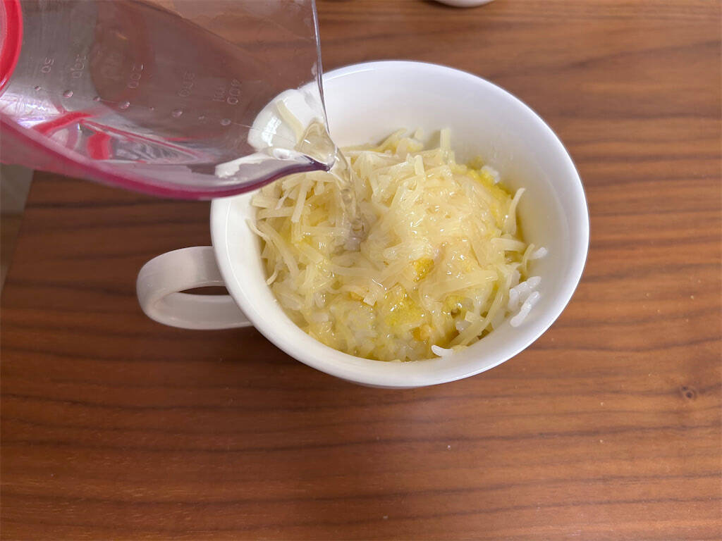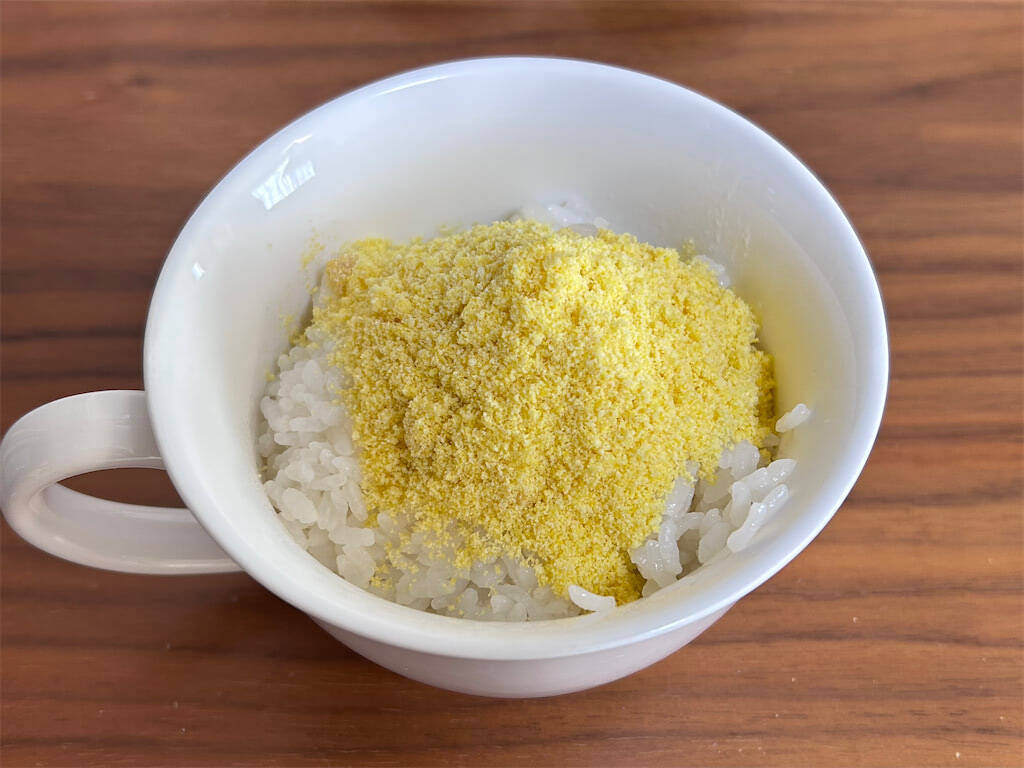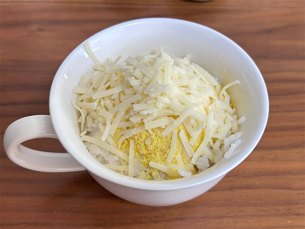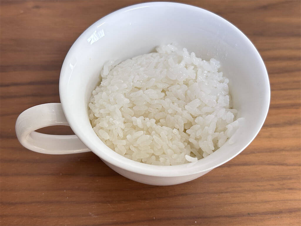 1. スープ用のカップにご飯を入れます。冷凍ご飯でもいいですが、筆者は炊き立てがおすすめです!食べたときに、お米の柔らかさを感じることができます。前日の夜、寝る前に炊飯器をセットしておけば、朝から慌てずに済みますよ~!
