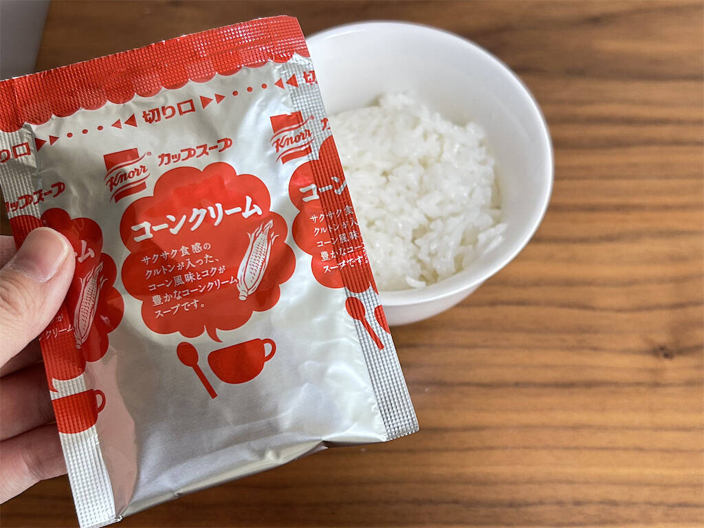 2. 1に「クノールカップスープ」を入れます。今回は、”コーンクリーム”で作っていきますよ!