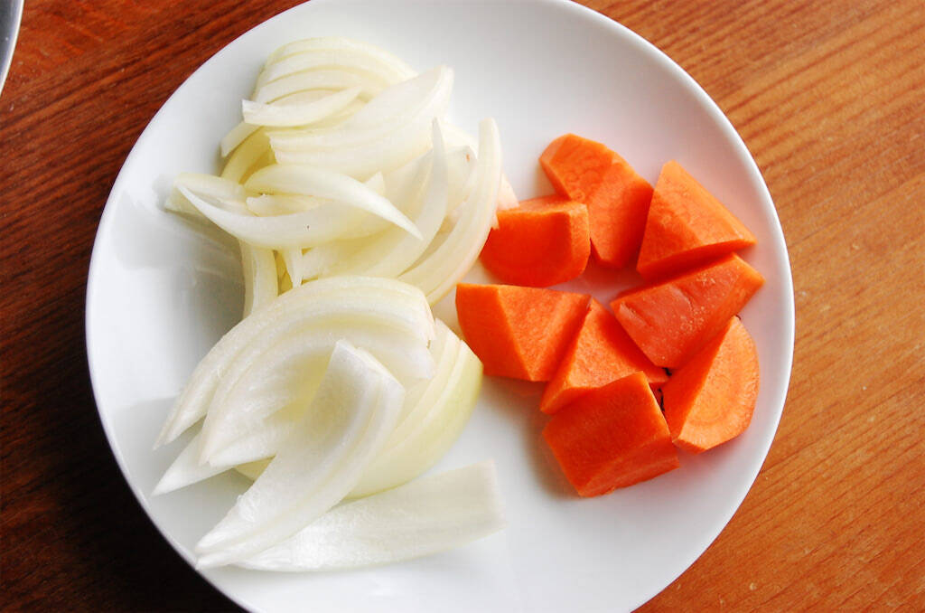 2. にんじんは皮を剥き、適当な大きさの乱切りにします。