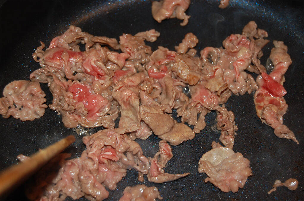 4. フッ素樹脂加工のフライパンに牛肉を入れ、表面だけ焼いて、一旦取り出します。