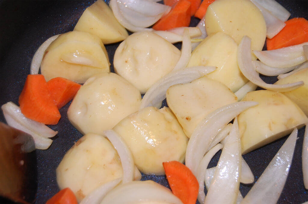 じゃがいもの端が少し透き通り、野菜に油がなじんだら、3を加えます。