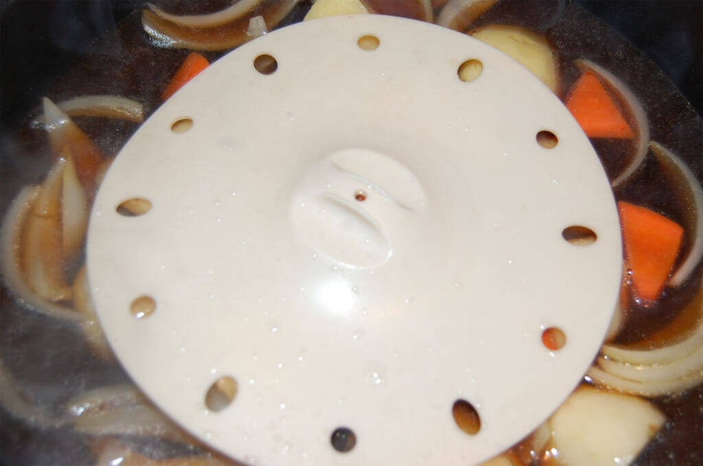 6. 野菜の上下を返し、牛肉を入れます。上下を返すと、じゃがいもやにんじんに、均等に火が入るそうですよ。