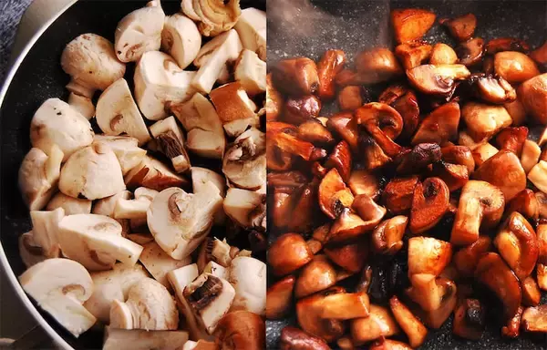 1. フライパンにサラダ油(適量、分量外)を引き、適当な大きさに切ったマッシュルームを入れて、こんがりするまで強火で炒めます。