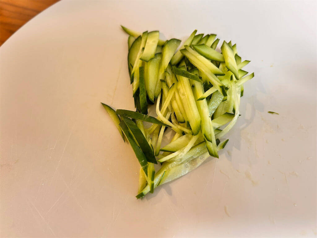 動画で、トッピングの分量は適量でいいとのことだったので、筆者はきゅうりもトマトも大好きだから、結構たっぷりめに入れることにしてみます!
