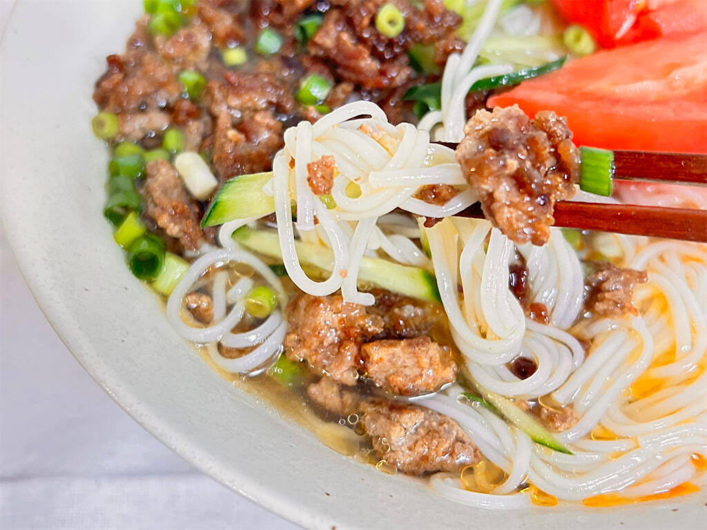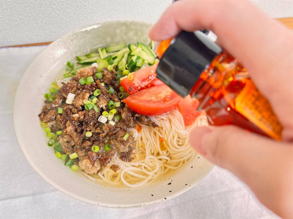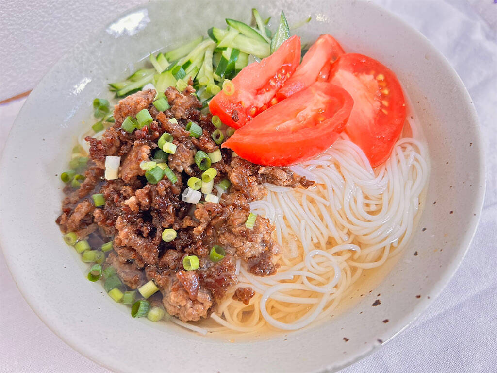うん、ツルっとしたそうめんに、ピリ辛の肉みそがしっかり絡んでおいしい!