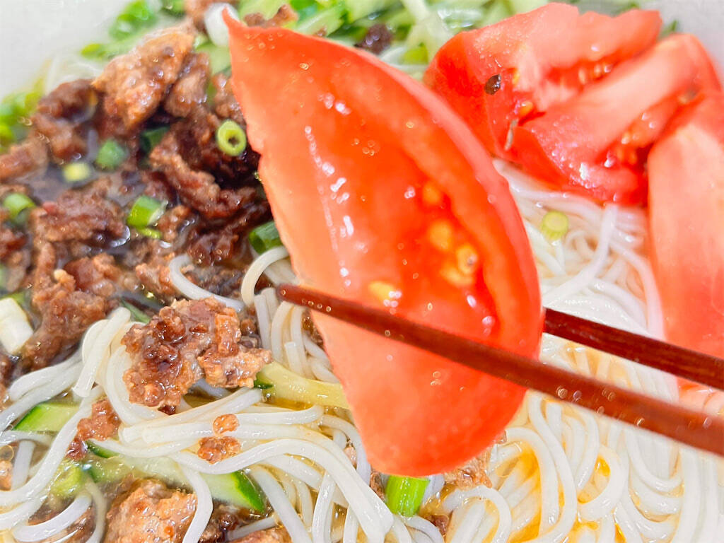 5.4のそうめんを丼に移し、1の肉みそと3のきゅうり、トマト、青ねぎをトッピング。