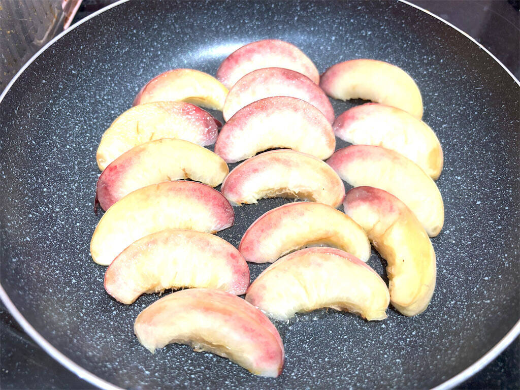 フライパンにオリーブオイルをひいて火をつけ(IHクッキングヒーターだと140~160℃)、2の桃を並べて焦げ目がつくくらいまで焼きます。