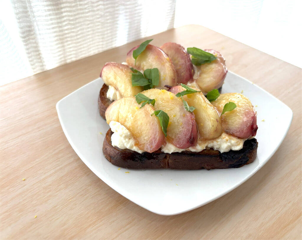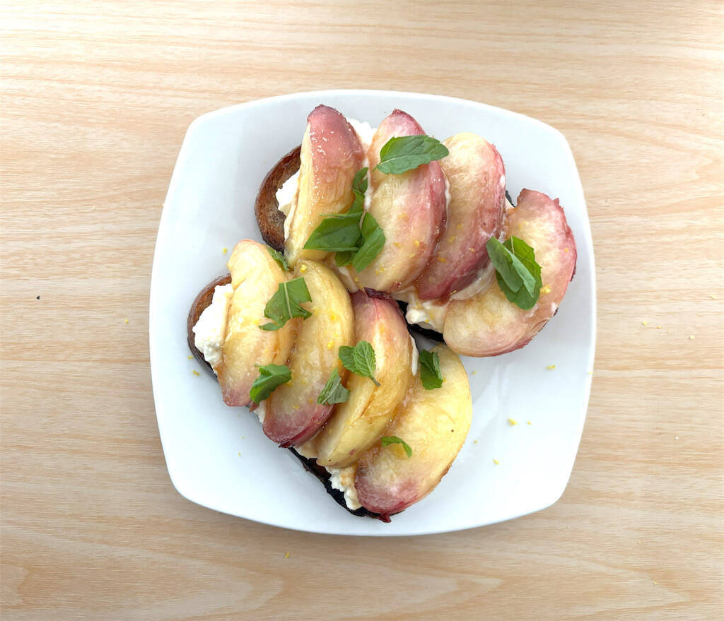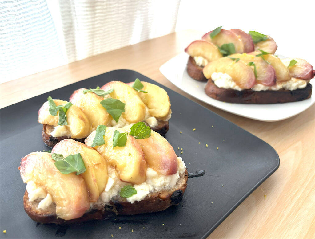 その上に桃を、パン1枚につき4切れ乗せ、レモンの皮をすりおろして振りかけ、オリーブオイル(分量外、適量)とレモン果汁を搾ってかけます。