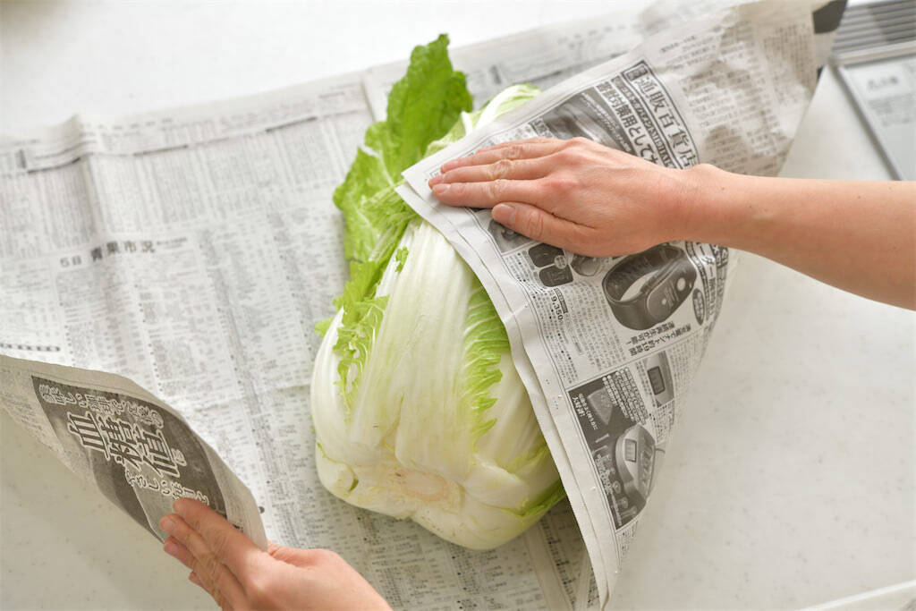「新聞紙で白菜全体を包みましょう。洗ったりせず、そのまま包んでくださいね。新聞紙で包んだ後は、暖房の効いていない廊下などに、立てて置いてください。こうすれば1か月はもちますよ」(丹生さん)