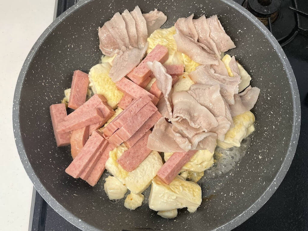 3.スパム、下茹でした豚肉、ゴーヤの順に加え、中火で約3分炒めます。