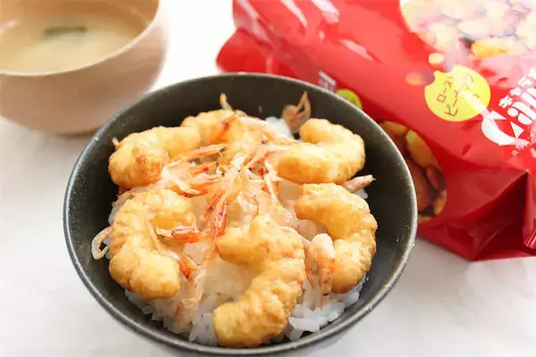 キャラメルコーンで「ほぼエビ天丼」は、ご飯にトッピングするだけの簡単レシピでした。桜エビの量が少なかったためか、ご飯にキャラメルコーンというほぼそのままの味わいになりましたが、サクサクとした食感は一般的なエビ天丼よりも優れていましたよ。