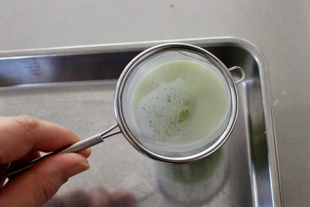 型に入れる前にもう一度茶こしなどでこすと、溶け残ってしまったゼラチンや青じその繊維が取れて、なめらかな食感になります。