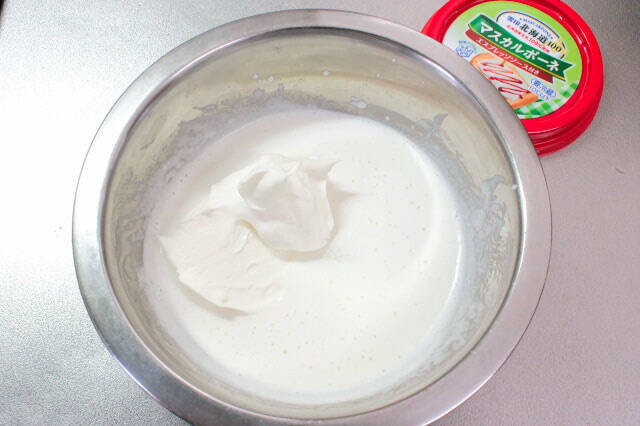 今回は氷水に浸けながら手で泡立てたので、生クリームがとろっとするまで4分ほどかかりました。マスカルポーネチーズを加える段階では、生クリームはとろみが付いた液体といった状態。