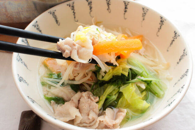 スープは顆粒の鶏ガラスープを溶かしただけですが、豚バラ肉と野菜から旨味が出ていてほっこりとするおいしさ。あっさりとしていますが、野菜の甘味を感じられてヘルシーな食べ心地です。