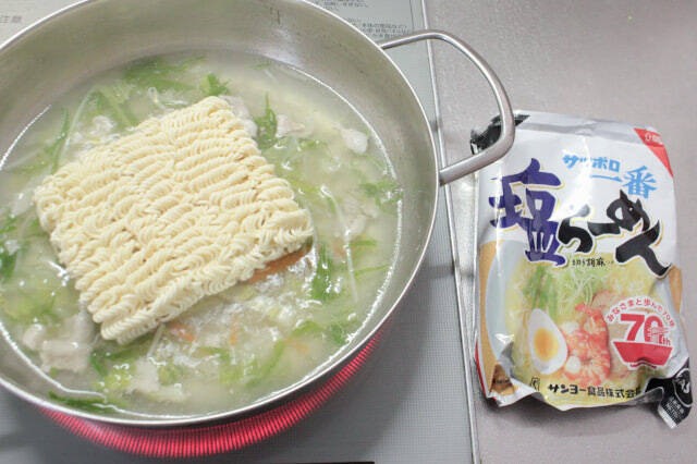 志麻さんは〆に焼きそば麺を入れて「塩ラーメン」にしてもおいしいと紹介していました。インスタント麺があったので、麺だけ加えて〆の「塩ラーメン」にしてみます。