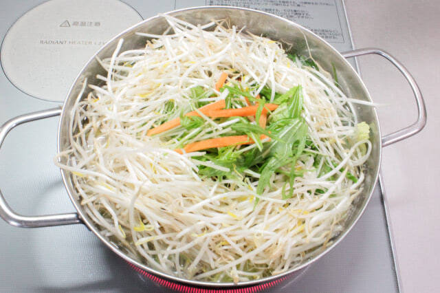 豚バラ肉が入ったスープの上に細切り野菜ともやしを乗せると野菜だけのお鍋のように。豚バラ肉が入っているのが分からないくらいにたっぷりの量!