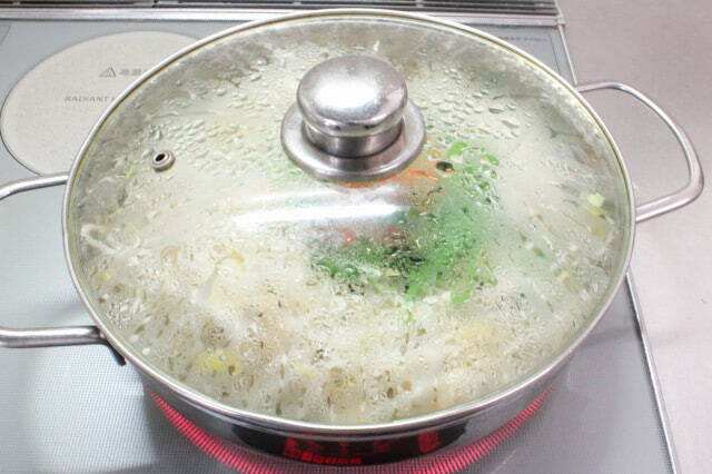 フタをして中火で3分ほど煮込んだら完成です♪野菜を細切りにしたことで短時間で煮えるのですね。
