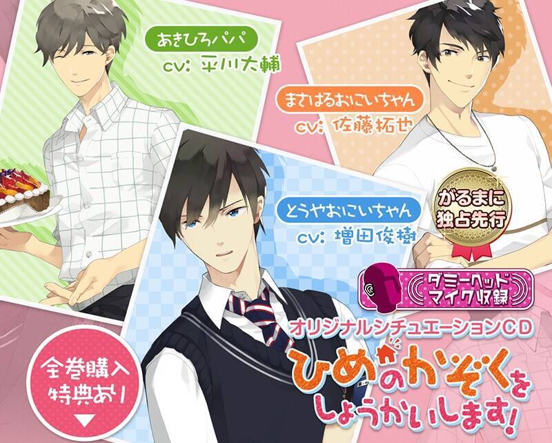 5歳のヒロインといっしょに暮らす家族として、長男の雅春役を佐藤拓也さん、次男の冬哉役を増田俊樹さん、父親の秋宏役を平川大輔さんがそれぞれ担当されています。