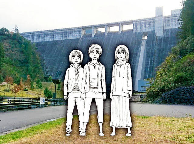 銅像は少年期のエレン、幼なじみのミカサとアルミンの3人が壁を見上げるデザイン。山あいのダムを巨大な壁に見立て、作中で人類を守る壁が壊された「その日」が再現されます。