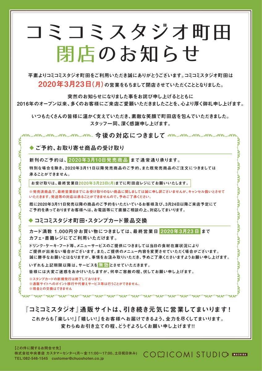 致し方ないとはいえ大ショックです。町田は決して近くない場所なのですが、コミコミさんの雰囲気が大好きでよく通っていました。コラボカフェで興味を持って本を買った作品もたくさんあります。またどこかで実店舗を再開して頂けますように。 ありがとうございました。 -
