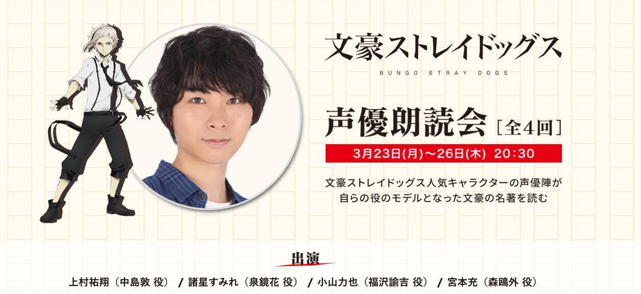 『文スト』声優朗読会4夜連続で放送決定!中島敦役・上村祐翔さんは「山月記」を朗読&劇場版『DEADAPPLE』の放送も