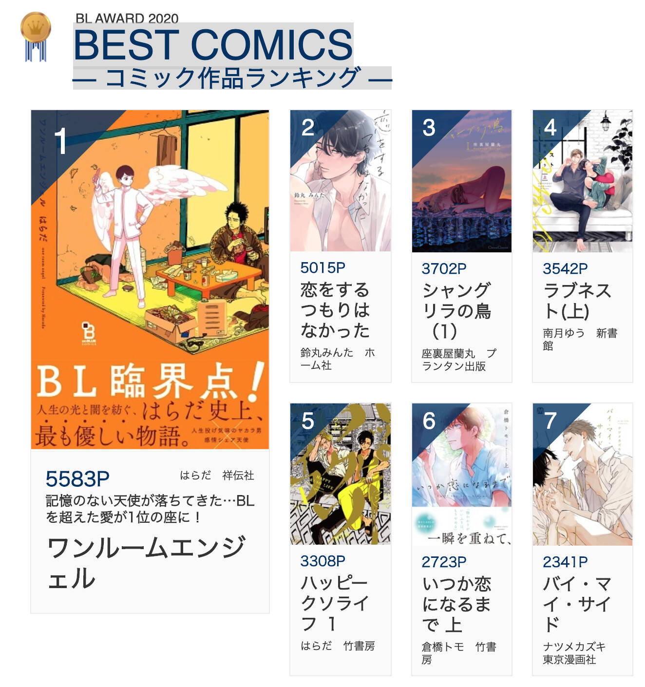 11回目の開催となる2020年の結果は、BLファンだけでなく一般読者からの支持も熱い『ワンルームエンジェル/はらだ』がBESTコミックスで第一位を獲得いたしました。