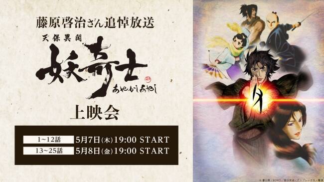4月12日に亡くなられた藤原啓治さんを追悼し、5月7日(木)・8日(金)の2日間に渡りTVアニメ「天保異聞 妖奇士」がニコニコ生放送にて一挙放送決定!