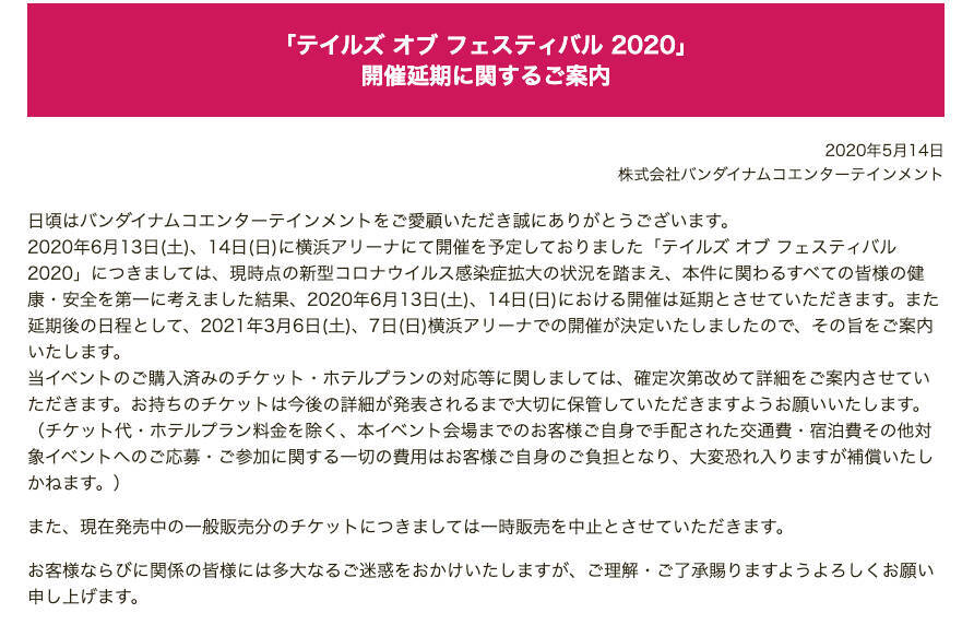 またお持ちのチケットは今後の詳細が発表されるまで大切に保管されるように呼びかけられました。