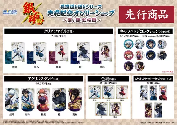 第1弾は不朽の名作・紅桜篇が登場。キャラバッジやアクリススタンドなどの、新規描き下ろしイラストを使用したグッズが多数発売される予定です。
