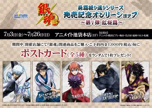 『銀魂』より“長篇振り返りシリーズ発売記念オンリーショップ”の開催が決定! 第1弾は不朽の名作・紅桜篇が登場。キャラバッジやアクリススタンドなどの、新規描き下ろしイラストを使用したグッズが多数発売さ...