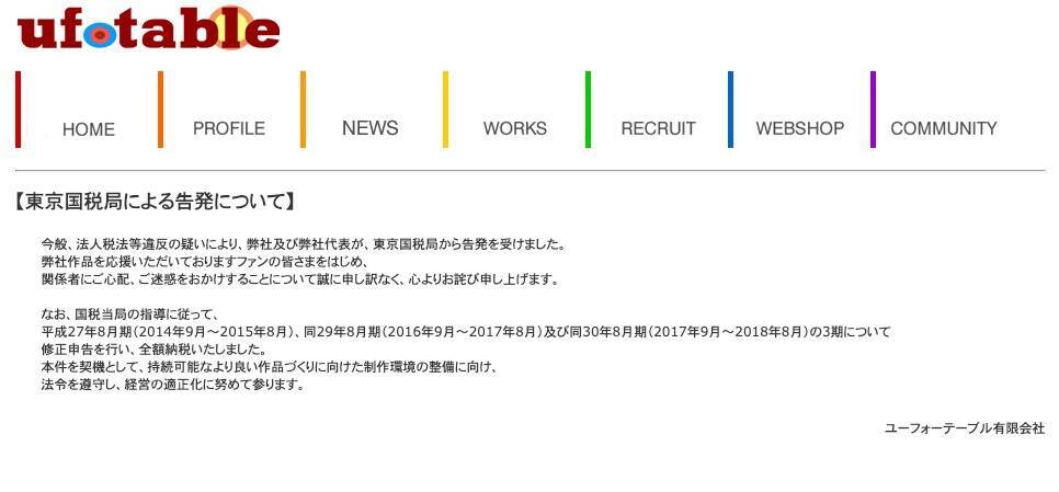 今般法人税法等違反の疑いで、弊社及び弊社代表が東京国税局から告発を受けました。ファンの皆様、関係者に心よりお詫び申し上げます。国税当局の指導に従って修正申告を行い、全額納税いたしました。より良い制作環境の整備に向け、法令遵守、経営の適正化に努めて参ります。 https://t.co/DaBQuRKf2k