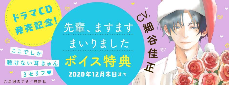 2020年6月11日(木)発売『まいりました、先輩』最新KC9巻の帯に記載されているURLに、帯折り返しにあるパスワードを入力すると声優・細谷佳正さんが演じる水川先輩の至福の胸きゅんセリフ3つを聴くことができます。