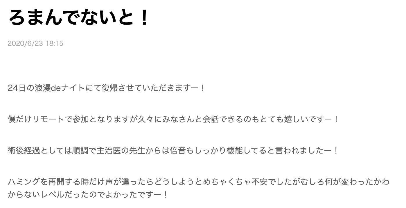 ブログの最後には「走ったりするのも声帯によくないってことで運動もしてなかったからなんか体が小さくなった気がするよ!早く戻したい!」とコメントされており、元気そうな様子が伺えます!