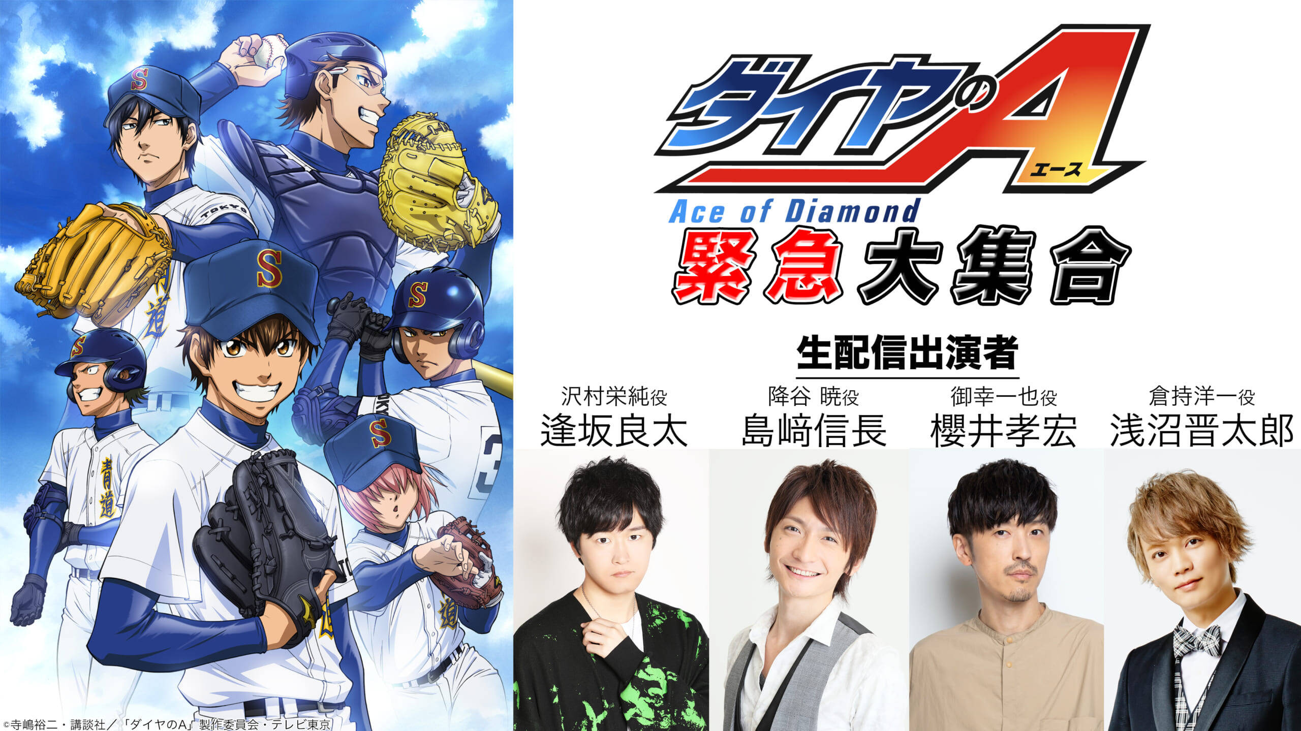「ダイヤのA 緊急大集合」生配信中にキャストに質問できる企画が実施されます。生配信番組に出演するキャスト4人(逢坂良太さん、島﨑信長さん、櫻井孝宏さん、浅沼晋太郎さん)に『ダイヤのA』にまつわる質問が聞けるチャンス!