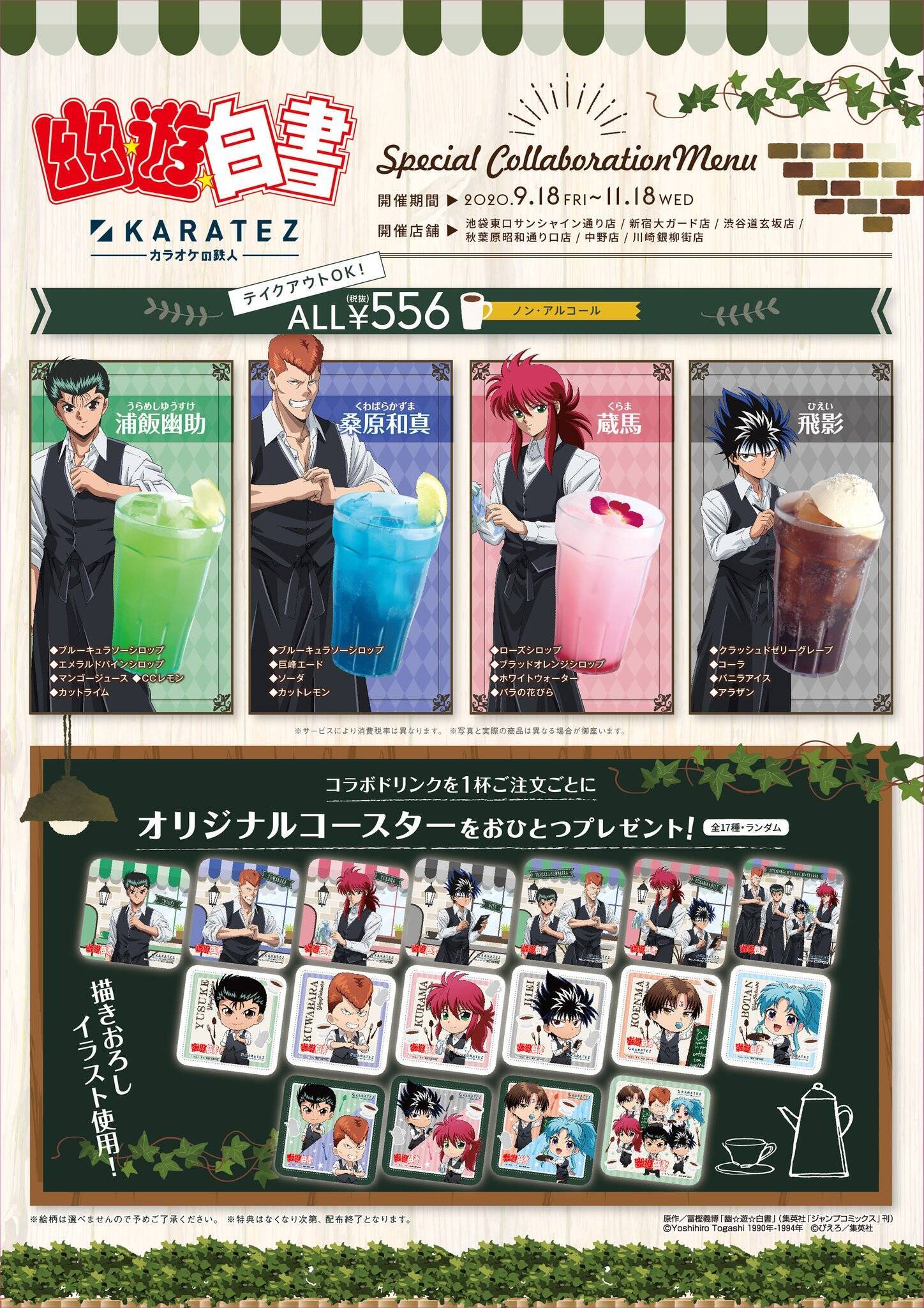 2020年9月18日(金)~11月18日(水)の期間、カフェ店員姿の幽助・桑原・飛影・蔵馬の描き下ろしイラストを使用したグッズやコラボドリンクを楽しむことが出来ます。