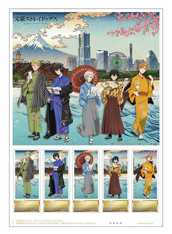 オリジナルフレーム切手には武装探偵社メンバーの中島敦、太宰治、国木田独歩、江戸川乱歩、谷崎潤一郎の描き下ろしイラストが登場。
