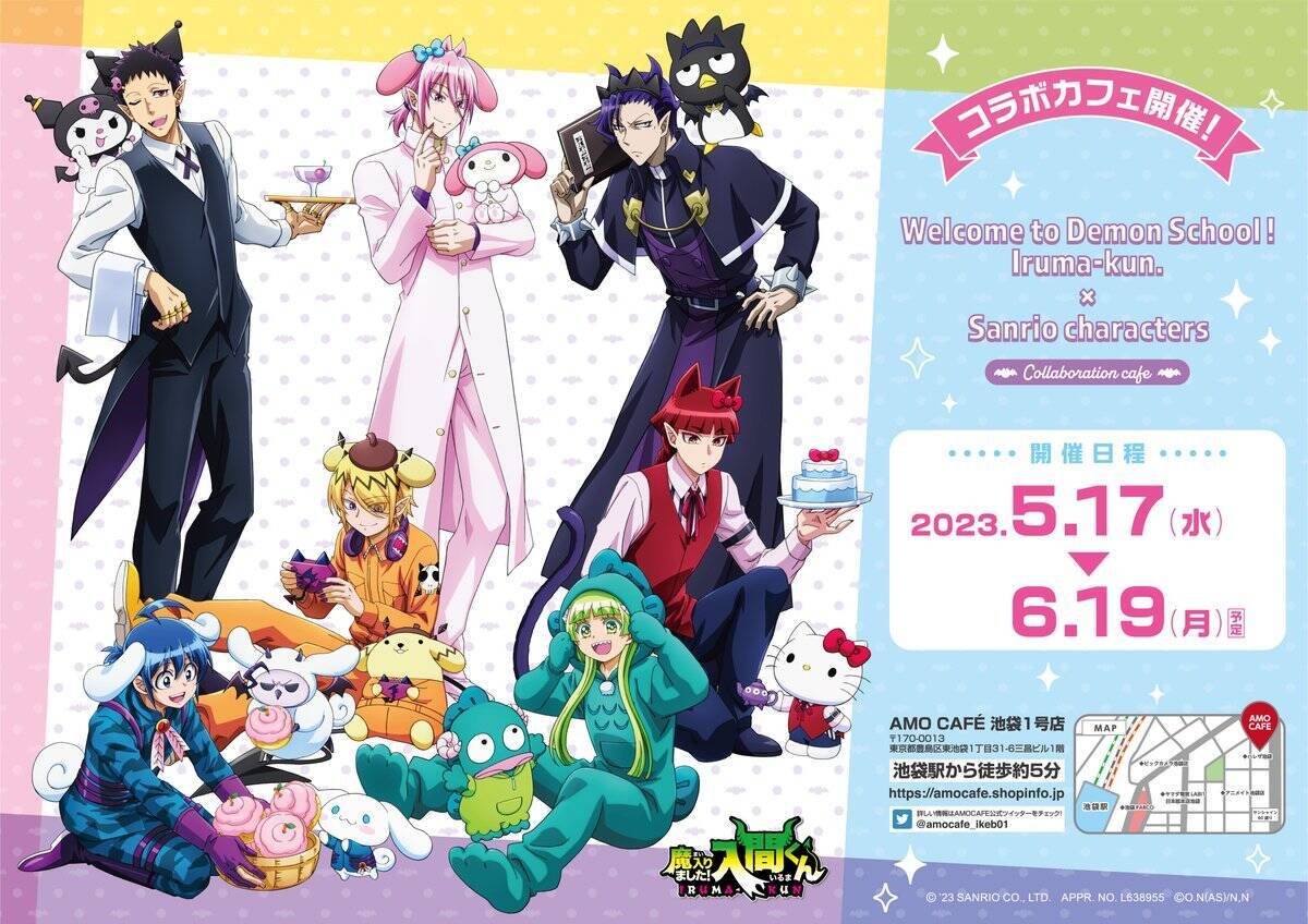 本コラボでは、TVアニメ「魔入りました!入間くん」とサンリオキャラクターズのコラボ等身イラストが登場。入間くんやアスモデウス、クララといった主要キャラクターたちと、ハローキティ・マイメロディ・シナモロールたちがお揃いの耳や衣装を身につけた姿が描かれました。