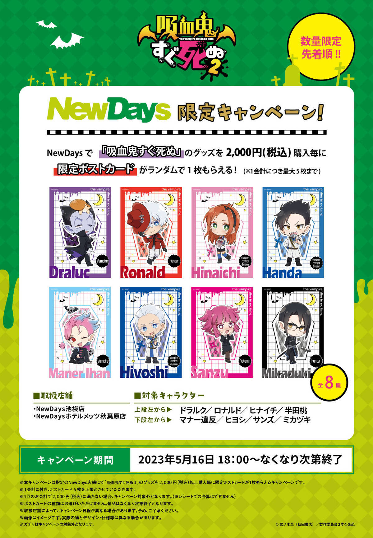 NewDays池袋店、NewDaysホテルメッツ秋葉原店の2店舗にて、『吸血鬼すぐ死ぬ』のグッズを2,000円(税込)お買い上げごとに、「NewDays限定ポストカード(全8種)」がランダムで1枚もらえます。