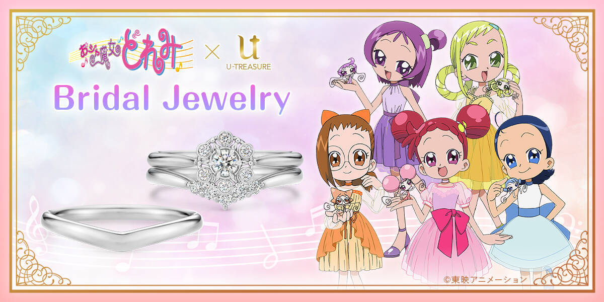 ユートレジャーから、『おジャ魔女どれみ』とコラボレーションしたブライダルリングが、ユートレジャーコンセプトストア池袋・ユートレジャーオンラインショップにて発売されました。ラインナップは、『も~っと!おジャ魔女どれみ』に登場する“パララタップ”をモチーフにしたエンゲージリング(婚約指輪)と、5人の絆を表現したデザインのマリッジリング(結婚指輪)です。