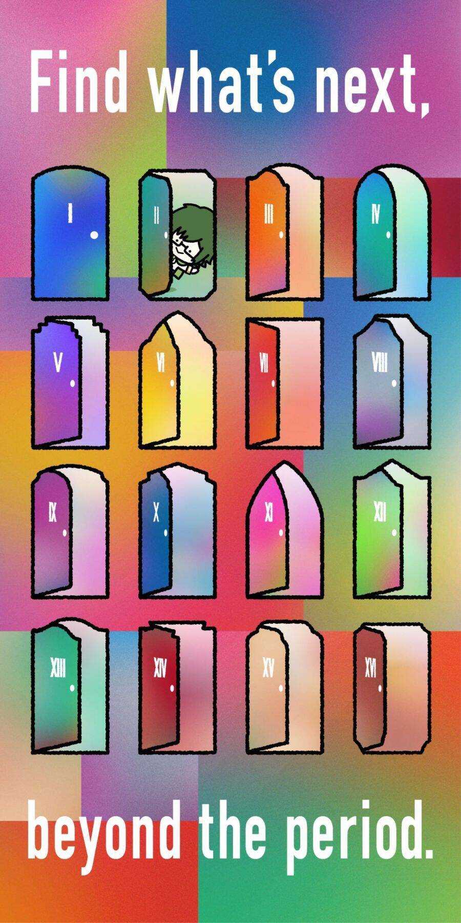 カウントダウンイラストは、16枚の扉から各キャラクターが顔を出すというもの。よ~~~く見ると扉が、アイドルたちのメンバーカラーになっていますね。