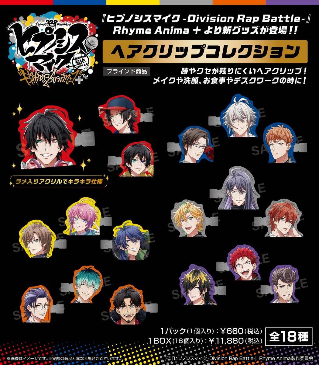 新グッズ「ヘアクリップコレクション」は、『ヒプアニ』に登場する各キャラクターの顔がついたヘアクリップです。ラインナップは全18種。トレーディング商品となっており価格は1個660円(税込)、1BOXは11,880円(税込)です。