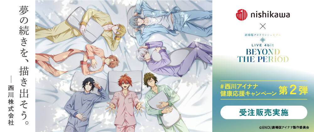 「#西川アイナナ 健康応援キャンペーン」では、多忙を極める「IDOLiSH7」のメンバーに、質の良い睡眠で疲れをとり最高のパフォーマンスを発揮いただきたいという想いから、2023年4月よりコンディショニングサポーターを担当しています。今回の第2弾コラボでは、西川の寝具を使用した「IDOLiSH7」のビジュアルやモチーフがデザインにあしらわれた特別コラボアイテムが受注生産にて登場。