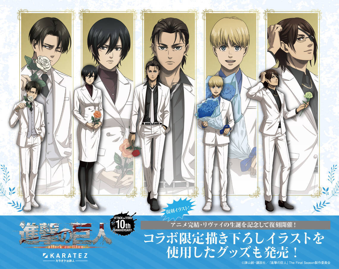本コラボの描き下ろしイラストにはエレン・ミカサ・アルミン・リヴァイ・ハンジが白スーツ姿で登場。それぞれ花を手にしており、まるでプロポーズをしているようなイラストに仕上げられています。