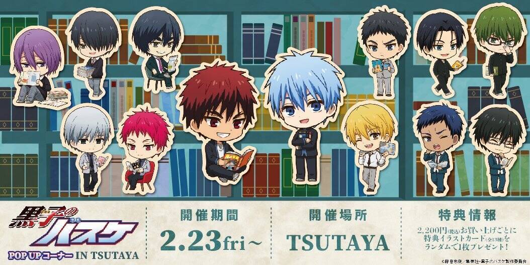 『黒子のバスケ』読書ver. ミニキャラグッズ購入2,200円(税込)ごとに「特典イラストカード(全13種)」がランダムで1枚プレゼントされます。