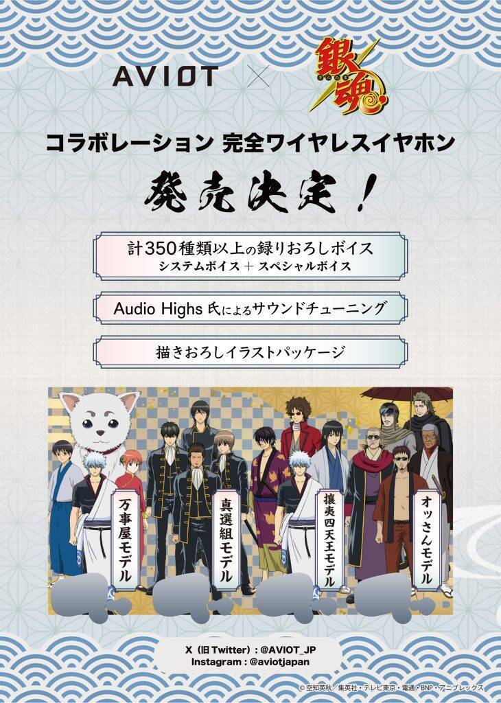 『銀魂』と「AVIOT」のコラボが決定し、万事屋・真選組・攘夷四天王・オッさんのコラボイヤホンが登場。