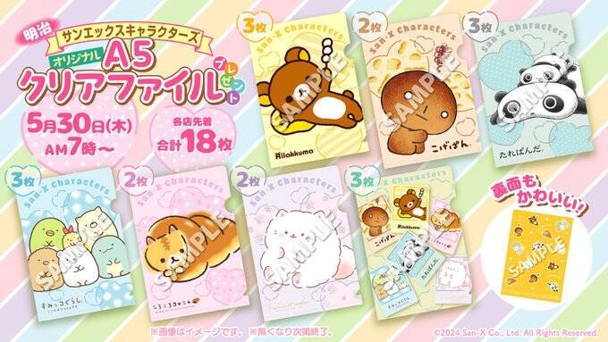 クリアファイルの絵柄はリラックマ・すみっコぐらし・たれぱんだ・こげぱん・ころころコロニャ・ふんわりねころん・集合の全7種。