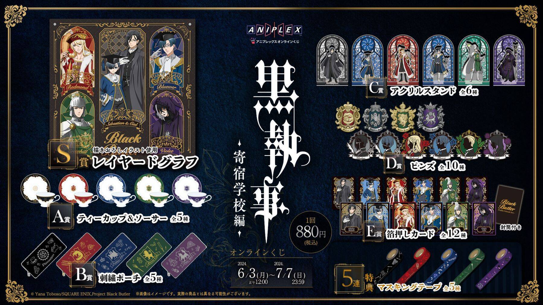 S賞には「レイヤードグラフ」、A賞には「ティーカップ&ソーサー」、B賞には「刺繍ポーチ」、C賞には「アクリルスタンド」、D賞には「ピンズ」、E賞には「箔押しカード(封筒付き)」がラインナップ。