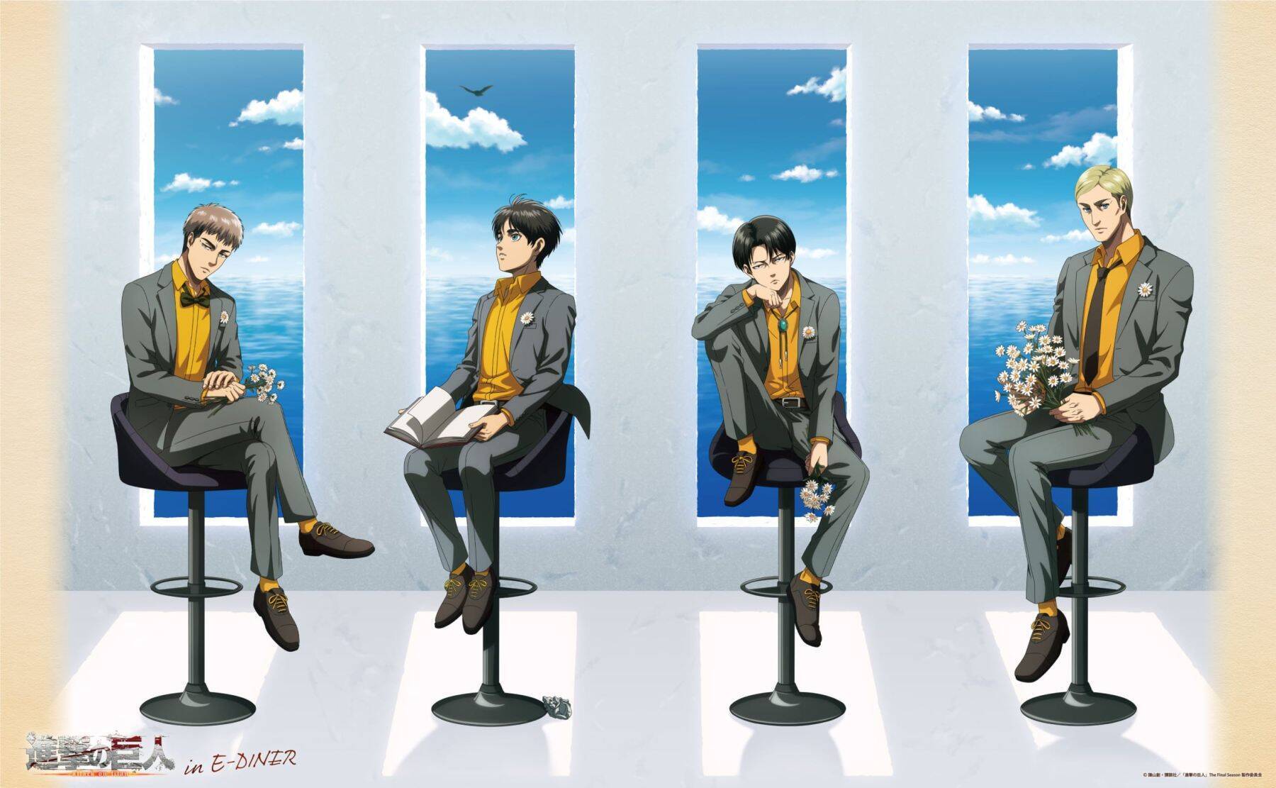 本イベントの新規描き下ろしには、エレン・ジャン・リヴァイ・エルヴィンの4人が登場。海が見える空間に華や本を手に座る姿が、どこか儚げな印象です。